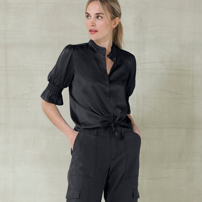 A customer-favorite season-after-season, we've taken all the OG "Go Fleamarket Top" details you love and added a shiny (charmeuse) spin to it.