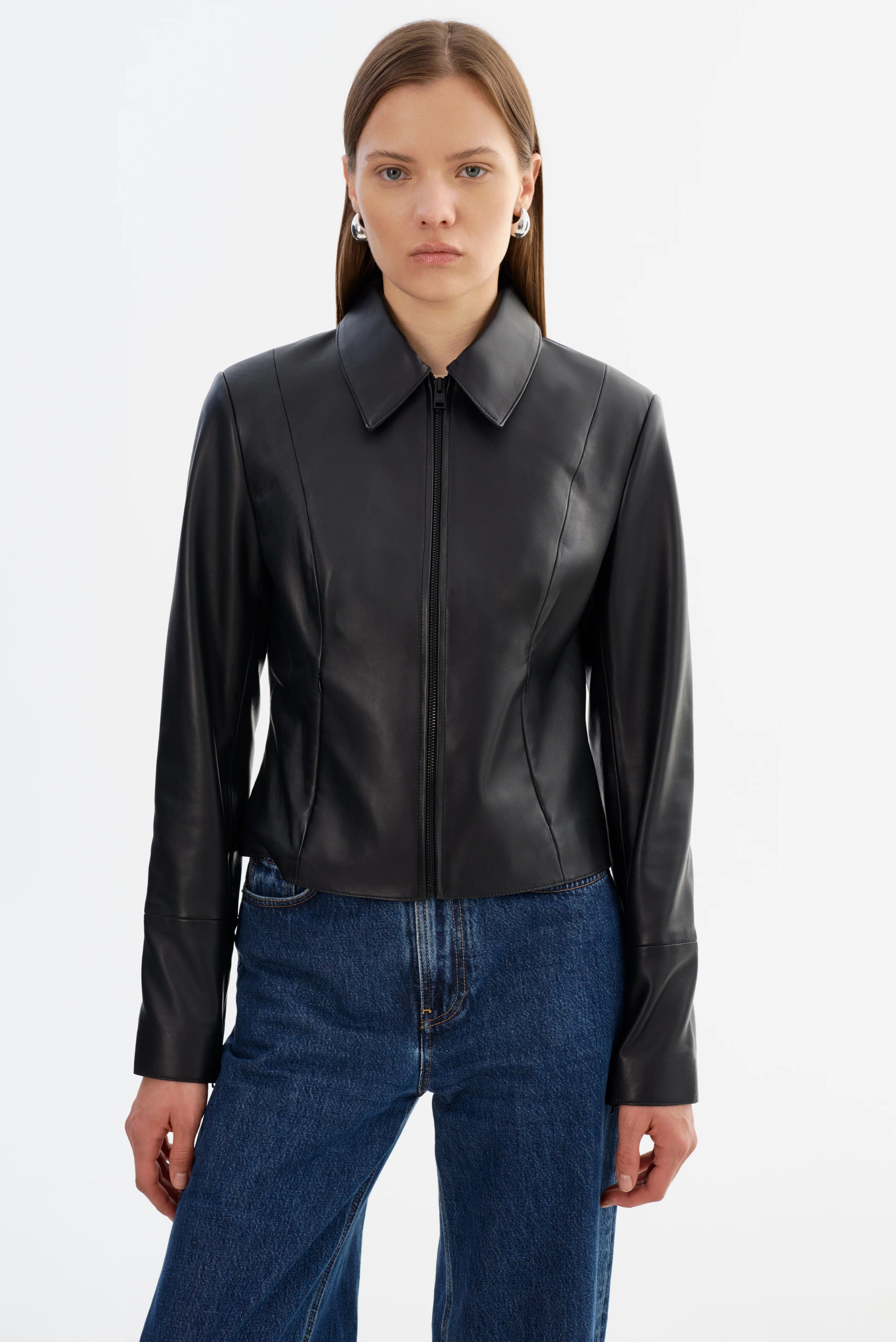The OCEANA is a minimalist leather jacket that seamlessly blends a vintage-inspired hourglass silhouette with contemporary elegance and appeal. It features a pointed shirt collar, invisible zipper pockets, and invisible zipper cuffs, adding a sleek, seamless look. Fully lined for comfort, the OCEANA Leather Jacket is a chic addition to any wardrobe, perfect for elevating your ensemble.