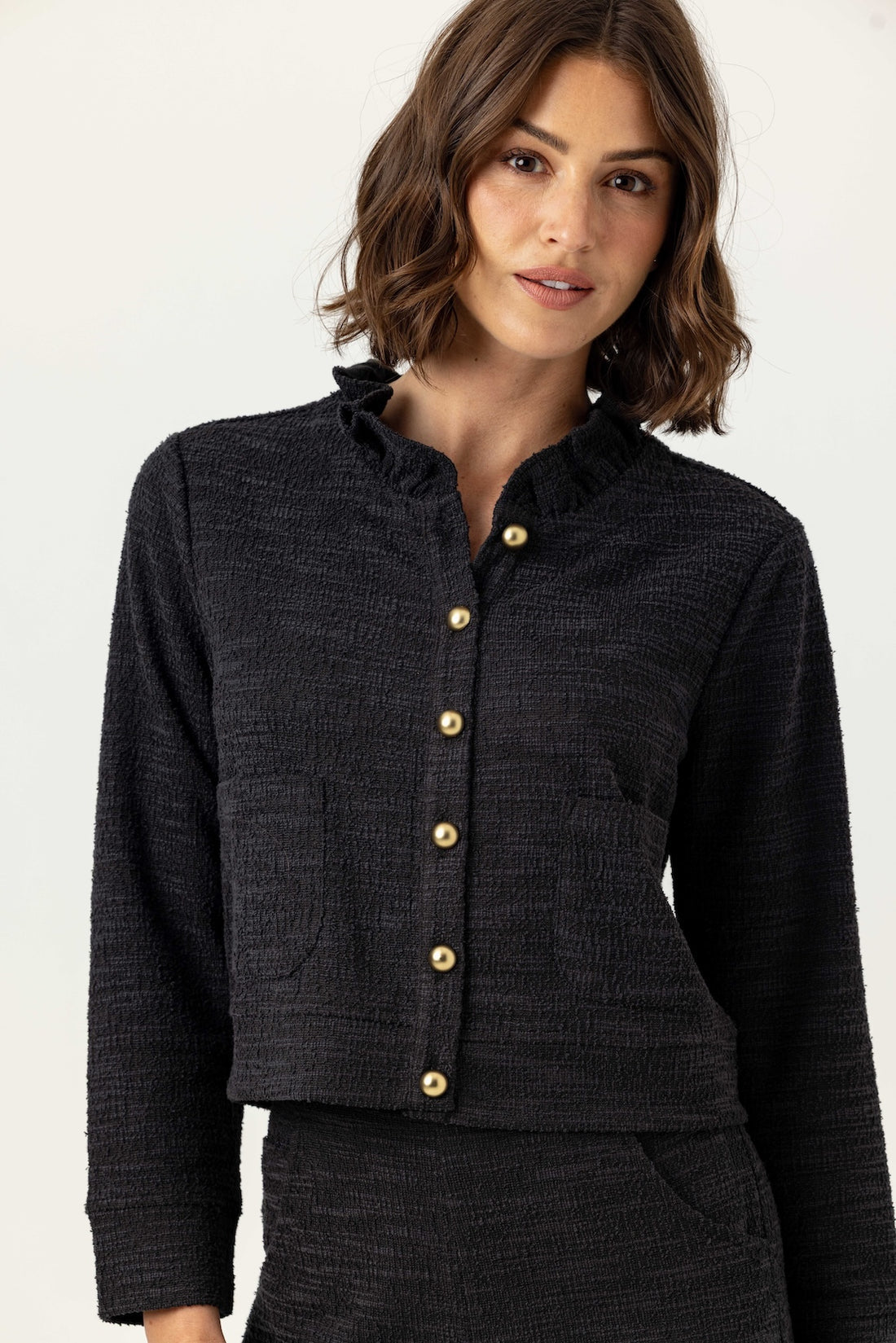 - Classic cardigan with patch pockets, a ruffle collar, and elevated gold buttons