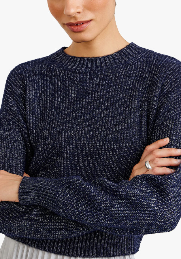 Marled yarns add dimension to this chunky, casual-chic sweater shaped with subtle blouson sleeves and a fitted waistband.