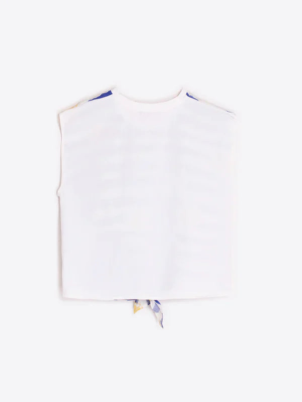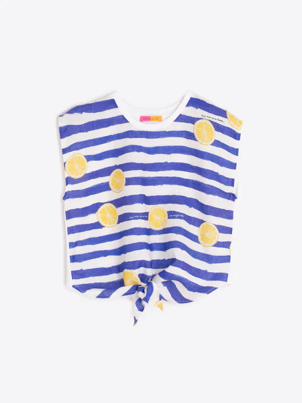 Blue and white striped sleeveless t-shirt with lemon print. Round neck. Front knot.