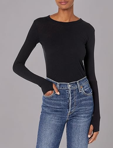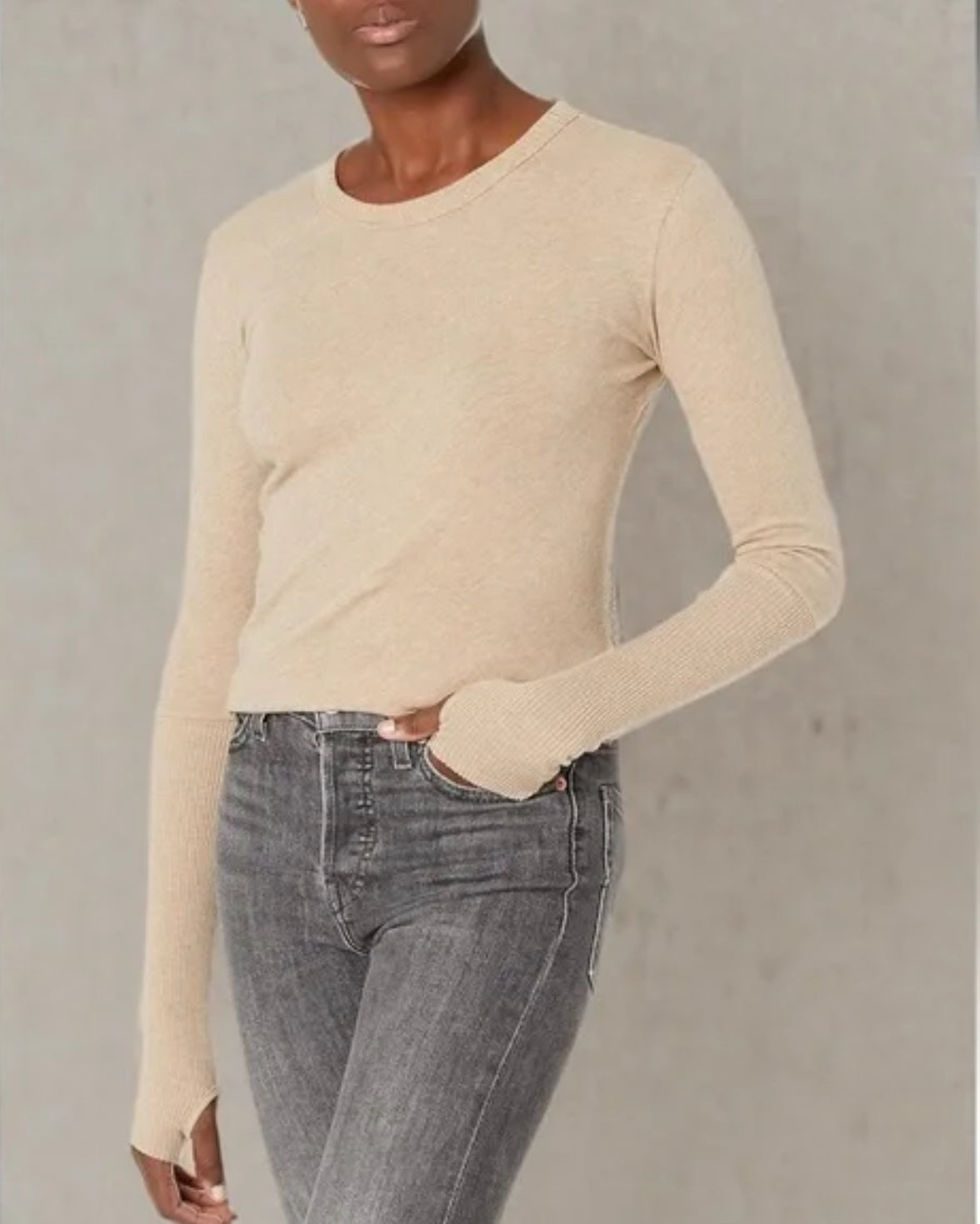 The cuffed crewneck top is fitted, with an elongated, curve-contouring silhouette. Cut from the brand's signature soft cashmere jersey, it embodies the perfect combination of lightweight sweater and luxurious teeshirt. This piece features a jersey body and rub cuffs with thumbholes.